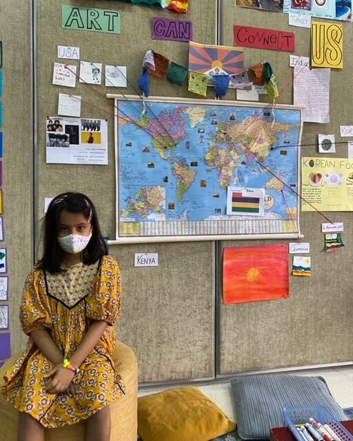 Gyaana shows us her colored collection of India’s National symbols: the Banyan tree, Peacock, Mangos, tiger, and Indian flag.